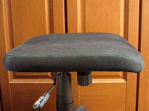 これが、問題のデスクチェアなのですが。座る部分のクッションが、わずかにへこんでおり、見た目以上に、クッションが効いていません。座ると、底に当たる感じです。