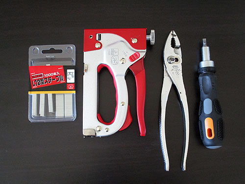 まずは、張り替えに必要な道具です。上の画像の左にあるのが、太めのホッチキスの針のようなものと、それを打ち込むためのタッカーです。