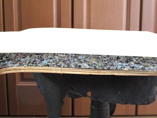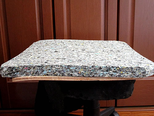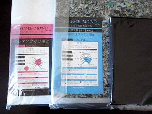 これが、今回、クッションとして入れ替える ウレタンです。どちらも、椅子に使われるものなのですが、白い方は、座れば沈むような柔らかいもの、色が混ざった方は、チップウレタンで固く、座っても大して沈みません。