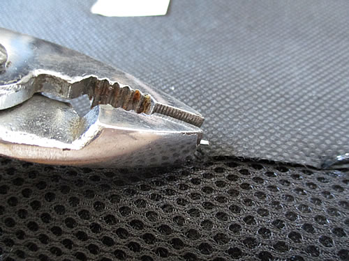 これは、簡単そうだと思ったのですが。この針、ペンチで抜くのは、結構、大変です。しかも、針を抜き、裏面の生地をめくると、さらに、内側にも針があり。
