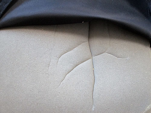 張り地を外すと、クッションが見え、体重がもっともかかる部分に亀裂がありました。全体的なクッションのへたりもあり、亀裂もあるため、こうなると、そのままではお尻が痛くて座れません。