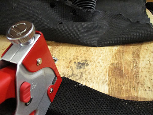 後は、デスクチェアを逆さまにして、クッションを押さえつけつつ、生地を引っ張りながら、タッカーで固定です。こ