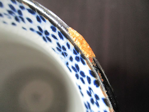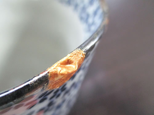 金継ぎの場合、『刻苧(こくそ)』という麦漆に木粉や砥粉などを混ぜ、天然のパテを作り、それで埋めます。その後、余分な部分をヤスリで削り、漆と金粉で仕上げになり、結構な手間になります。