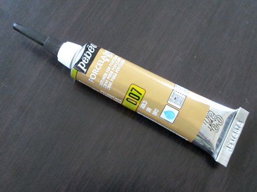 最初は、欠けた部分を何かで補修して、その上から陶器用絵具を塗ろうと思っていたのですが。この絵具、最後は、焼き固めることから、塗っては焼いてを繰り返せば、このくらいの欠けた部分なら、埋められるんじゃないかと考え、これだけでやってみることに。