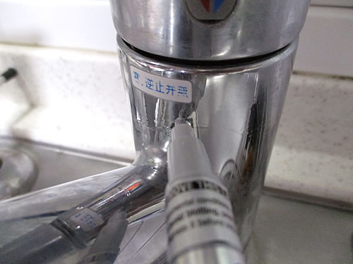 いよいよ、剥がれたメッキの補修です。調べたところ、フローリングの補修のように、ありがちなものではないようで、家庭用の補修剤のようなものが見つかりません。