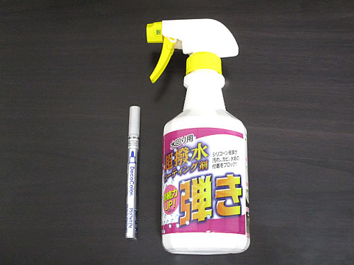 そこで、『マービー(MARVY) 油性顔料マーカー デコカラープレミアム シルバー 細字 240P-S』と『友和 Tipo s 超撥水剤 弾き!』を用意しました。