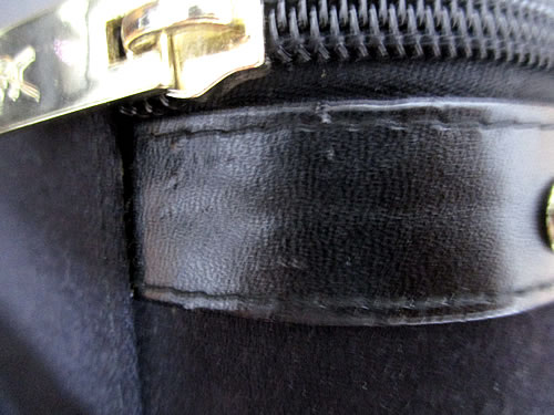 化粧ポーチを囲むように付けられた合皮部分も、時間が経っているせいか、一部、はがれていました。