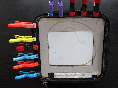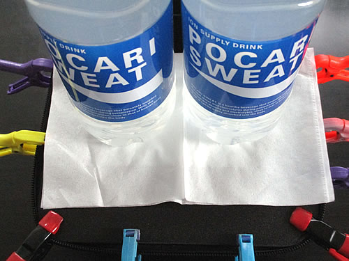 こんな感じで、接着した部分をクリップで固定し、真ん中部分は、ペットボトルの重みで固定しました。