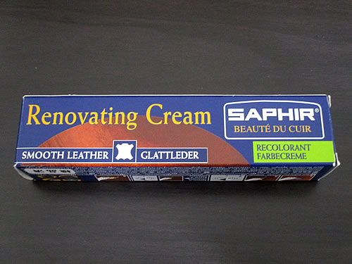 今度は、そこに、革靴のひび割れなどの補修剤『サフィール 補修 クリーム ブラック』を塗ってみました。これは、合皮や革製品の補修に使えるというものです。