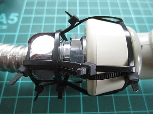 上の画像は、半年前のものです。ゴムパッキンが欠けた部分は、自己融着テープ『ニトムズ プロセルフ』を水道管に巻いて補い、固定の爪がないところは、PCケーブルをまとめる結束バンド『エレコム ケーブルタイ (黒)140mm 30本 LD-T140BK30』で締め上げました。