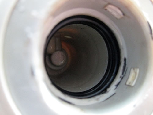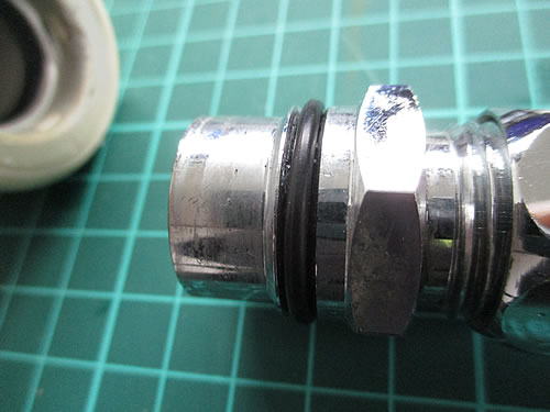浄水器の部品側に、白い帯状のゴムパッキンの代わりに、リング状のゴムパッキンを2つ並べて入れ、差し込む方の蛇腹の水道管側にも2つ、ちょっと小さ目のゴムパッキンを先に付け、固定する部分の溝にも、ゴムパッキンを入れてました。上の画像では、先に付けたゴムパッキンがない状態です。
