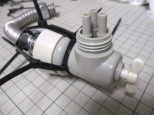 考えてみたら、単純に、接続した部分が外れなければいいだけなため、この部品に新たにゴムパッキンを付け、両側から結束バンドで締め上げればとなりました。