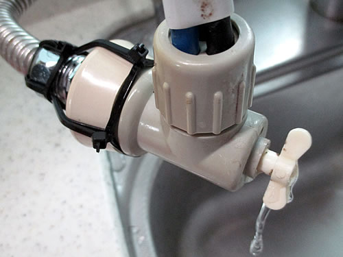 先から出ている水は、浄水器の捨て水です。浄水器のタンクは、3Lほど入り、壊れる前は、30分ほどで空から満杯になったそうです。それが、結束バンドで補修したものでは、1時間ほどかかるようになりました。