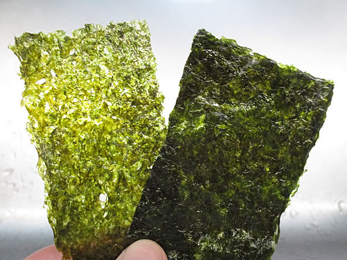 厚みが違い、いつも食べている海苔は、訳アリの2倍ほどの厚みがあります。厚みがある分、しっかりしていて、硬めな感じです。