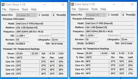 室温は26℃、1時間ほどパソコンを使い、左が冷却ファンを使う前、右が使った後です。CPUのコア温度が、3~6℃くらい下がっています。