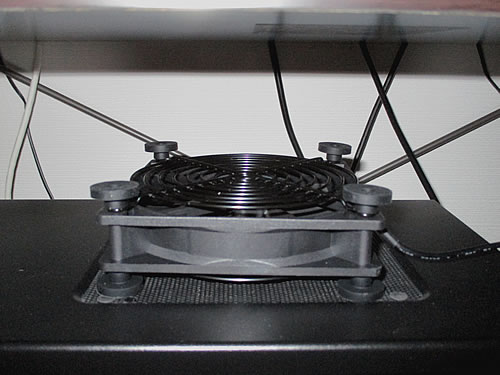 冷却ファンを置く場所は、デスクトップPCの上、熱を逃がす通風孔のところです。その真下には、CPUがあります。PCケース内ではなく、PCケースの外側に置き、ケース内の熱を吸い上げるという感じです。