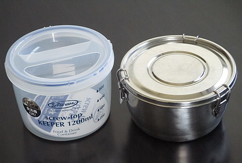 壊れたステンレス容器と比べると、見た目は、こんな感じです。容量は、ステンレス容器が1L、新たに購入した方が、1.2Lです。高さが10cmほどあり、冷蔵庫の棚に入る大きさでした。