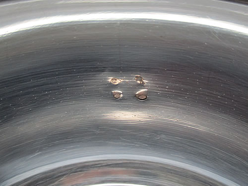 漏れ出しているところが分かり難く、ステンレス容器のフタを押さえる金具から漏れていました。2枚目が内側なのですが、見た目では、分かりません。金具よりも上に水を入れたところ、下に敷いたティッシュペーパーが、みるみる塗れ出しました。