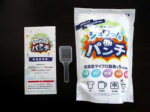 前回の『スライムパンチ』に続き、今度は、『シュワッ!とパンチ』という洗浄剤です。これは、粉末を水に溶かして使い、洗浄、漂白、除菌、消臭、脱脂というもの。これも、テレビショッピングで紹介しています。