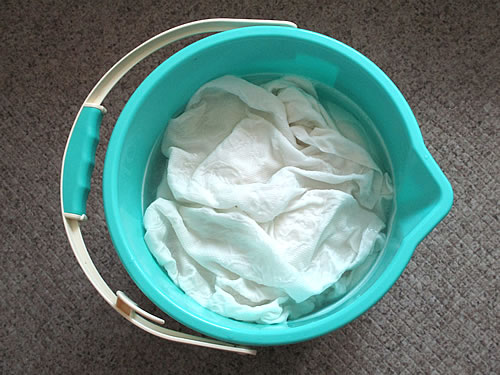 早速、黄ばんだシーツを『シュワッと!パンチ』で洗ってみることに。説明書を読んだところ、ドラム式洗濯機には、直接使えないと書かれており、バケツに12Lほどのぬるま湯を入れ、計量スプーンで4杯入れました。