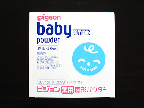 パフ付きで持ち歩きに便利なものと思い、『ピジョン 薬用固形パウダー パフ付 45g』を購入。今回は、アマゾンよりも安かった楽天市場にしました。ポストに届くため、受け取る手間もなく。