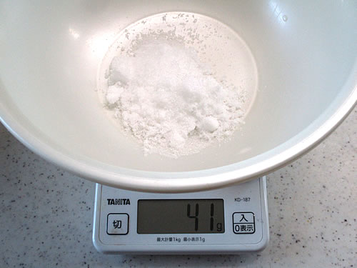 こんな感じで作っているのですが。ボウルをのせた状態で0gにし、砂糖、塩、クエン酸を次々と入れていきます。
