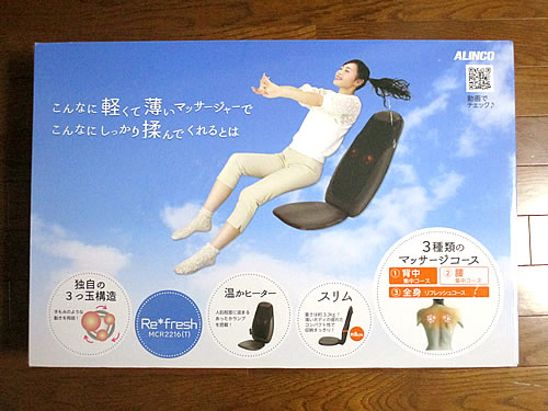 そこで、再び腰を痛めると大変なので、腰に良さそうなことをしようと、『ALINCO(アルインコ) シートマッサージャー Re・フレッシュ MCR2216』を購入しました。