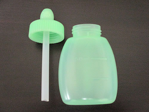 付属の液体を容器に入れ、やわらかい容器を押すと上から液体が出て、片方の鼻の穴から入れて、反対の穴から勝手に流れ出ます。