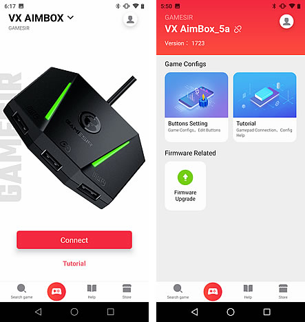 そこで、GameSirアプリをダウンロード。GameSir VX AimBoxと接続し、firmwareを最新のものに更新。これだけでも、マウスを通しての動きが、ちょっと遅いかなと感じるくらいまで改善します。
