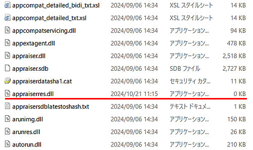 次に、コピーした先のフォルダ『win11』から、【sources】⇒【appraiserres.dll】をテキストで開き、キーボードのCtrl + Aで全て選択し、全て削除して、保存します。appraiserres.dllの容量は、0KBになります。