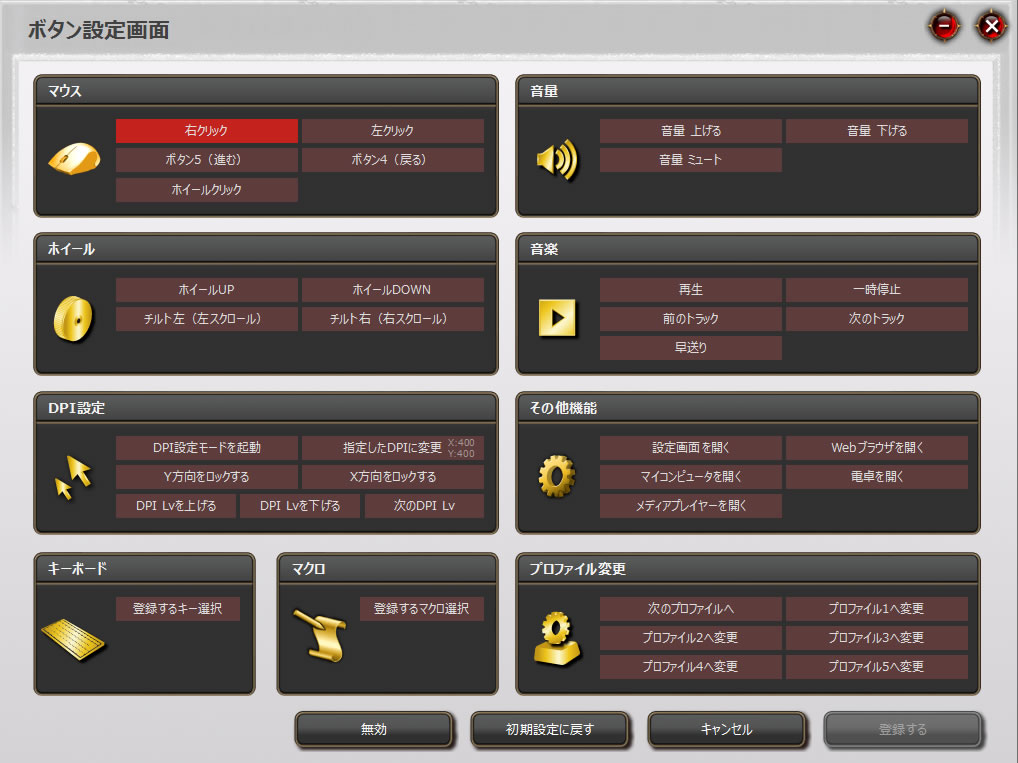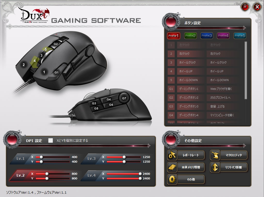 しかも、仕事用のボタン設定、ゲーム用のボタン設定などを作り、それらをマウスのボタン一つで5つまで切り替えられます。