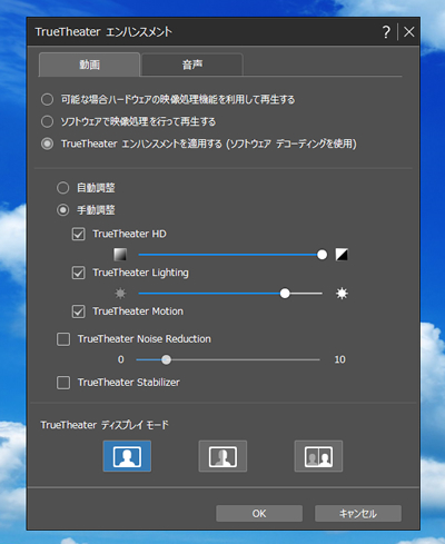 これは、高画質化のTrueTheaterが使われているためのようです。DVDの再生や動画ファイルのように、 TrueTheaterの微調整はできず、自動調節のみです。それでも、画質がいいことに変わりはありません。
