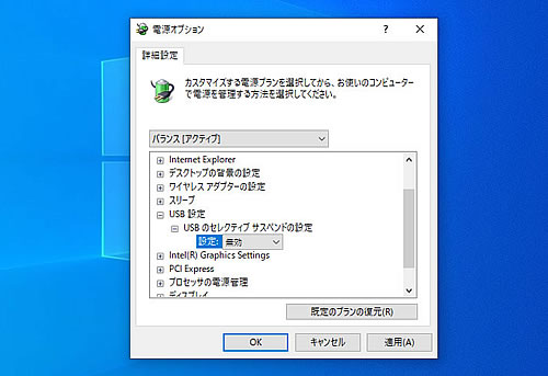 もう一つは、『お気に入りのプラン』の中の選択しているものの【プラン設定の変更】⇒【詳細な電源設定の変更】⇒【USB設定】を選び、『USBのセレクティブ サスペンドの設定』を無効にします。