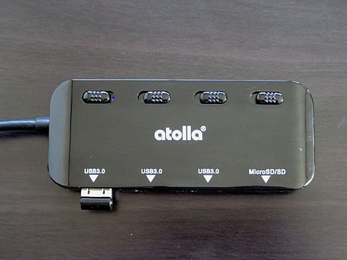 上の画像で、左端に付いているのが、Bluetoothドングルです。このUSBハブは、カードリーダーと各USBポートに、スライド式のスイッチが付いていて、手動でオンオフできます。USB3.0に対応しているため、PC側もUSB3.0なら、SDカードに保存した大容量のデータも比較的早くPCへ移すこともできます。