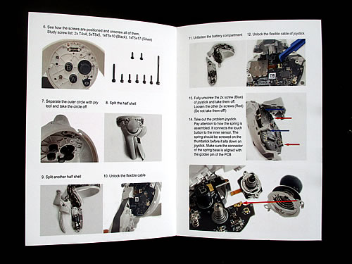 この中には、新品の部品が2つの他、交換に必要なドライバーなどの工具も揃っていて、分解の仕方を解説したパンフレットも入っています。早速、部品交換してみることに。