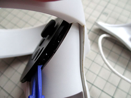 両面テープでカバーが取り付けられている部分があり、解説通りにドライヤーで温めてから、周りを外し、その隙間から、付属のプラスチックの棒を中に押し込むなどして、両面テープをはがし、ボタン周りの丸いカバーを外しています。