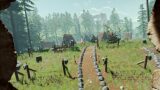 囲む範囲が広いとかなりの木材が必要になり、私は、木を切り倒すのが面倒なため、ダイナマイトに火をつけて置き、爆破で5,6本の木を一気に丸太にして、運んでいます。