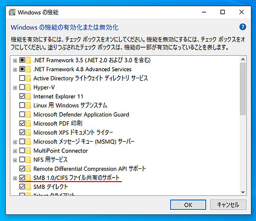 リストにある『SMB 1.0/CIFS ファイル共有のサポート』にチェックを入れ、OKを押して、完了です。その後、少し処理に時間がかかり、再起動する必要もあります。