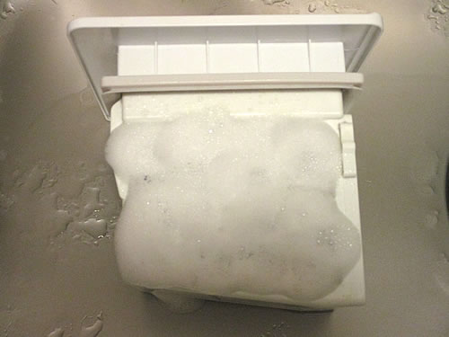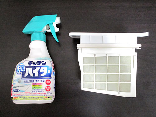 調べたところ、キッチン泡ハイターで落ちるとあり、流しのところでフィルターに泡ハイターを吹き付け、10分ほど放置。
